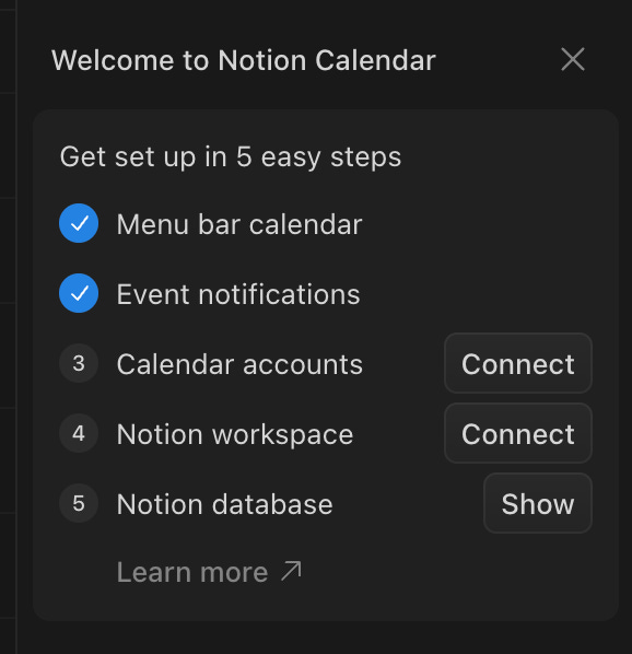 A simple example is Notion Calendar’s onboarding modal, which equips users in a quick and non-intrusive way. As a user, I’m not forced to do any of these, and I can mark them done (in which case the CTAs will disappear) or mark them un-done. The steps are simplified to 2-3 word titles, with explanatory modals and a link to learn more. When I’m done, I can quickly dismiss onboarding and find these setup items elsewhere in the product.